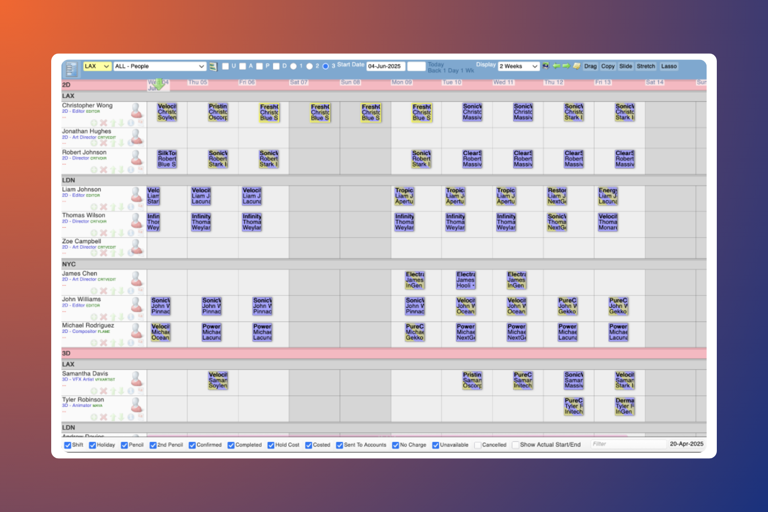 CETA’s visual scheduling tools make resource planning simple. The animated, colour-coded interface provides clarity for managing time and resources, such as monitoring availability for resources l for people, workstations, software licenses and holidays.